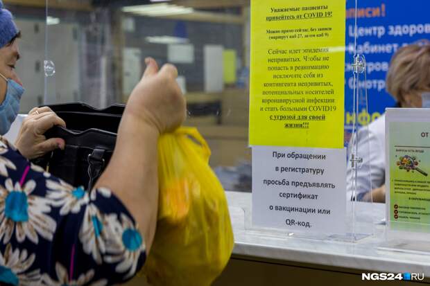 В поликлинике № 14 на улице Весны красноярцы заметили странное объявление — в регистратуре людей просят предъявить QR-код или сертификат о вакцинации. Такое объявление еще вчера журналистам ТВК скинули зрители. Сегодня, 25 ноября, мы убедились, что оно действительно есть и стоит возле окошка в регистратуру до сих пор.
