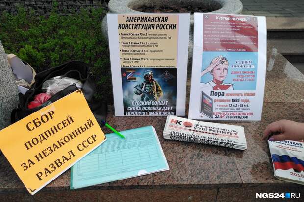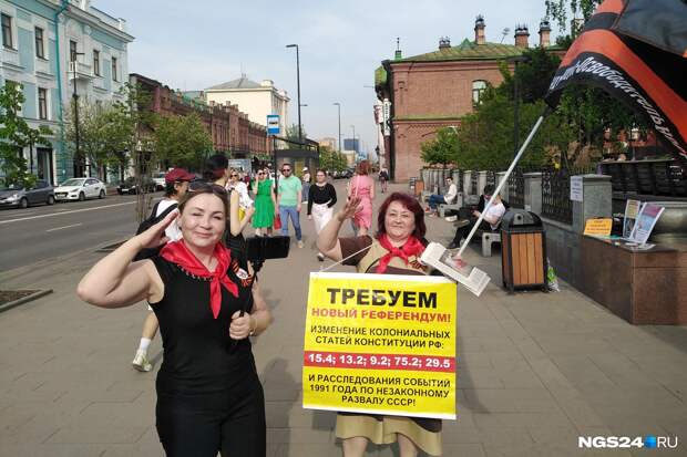 Параллельно женщины собирали подписи за то, чтобы «развал СССР был признан незаконным».Участницы акции пояснили журналистке NGS24.RU, что по их мнению, выход стран из СССР в начале 90-х был незаконным, так как не были соблюдены необходимые для этого процедуры.