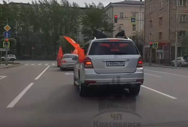 «Не стыдно вам?»: люди с флагами КПРФ катаются по городу на «Мерседесе» и поздравляют горожан с Днем Победы