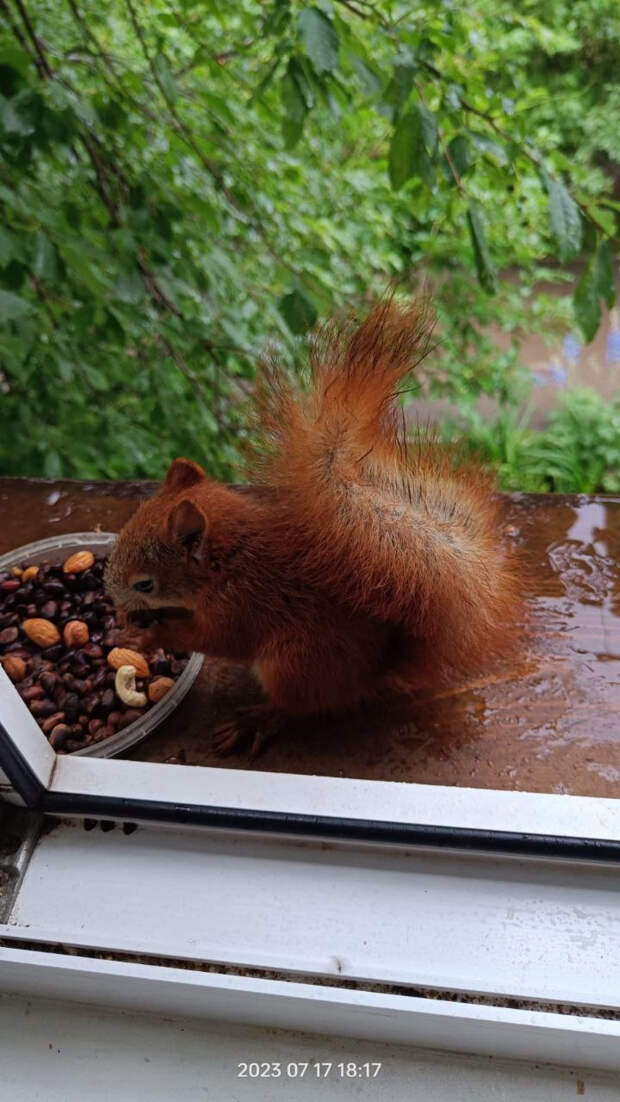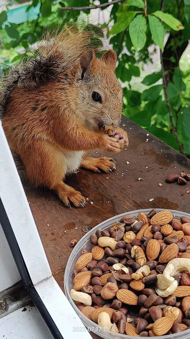 Постепенно о новом «кафе» узнавало всё больше белок. Уже два года регулярно приходят около пяти животных. Причём, они меняются — белкам свойственна миграция, они не всегда остаются на одном и том же месте долго, рассказала добрая женщина. Сейчас среди тех, кто приходит на обед — две кормящие белки.