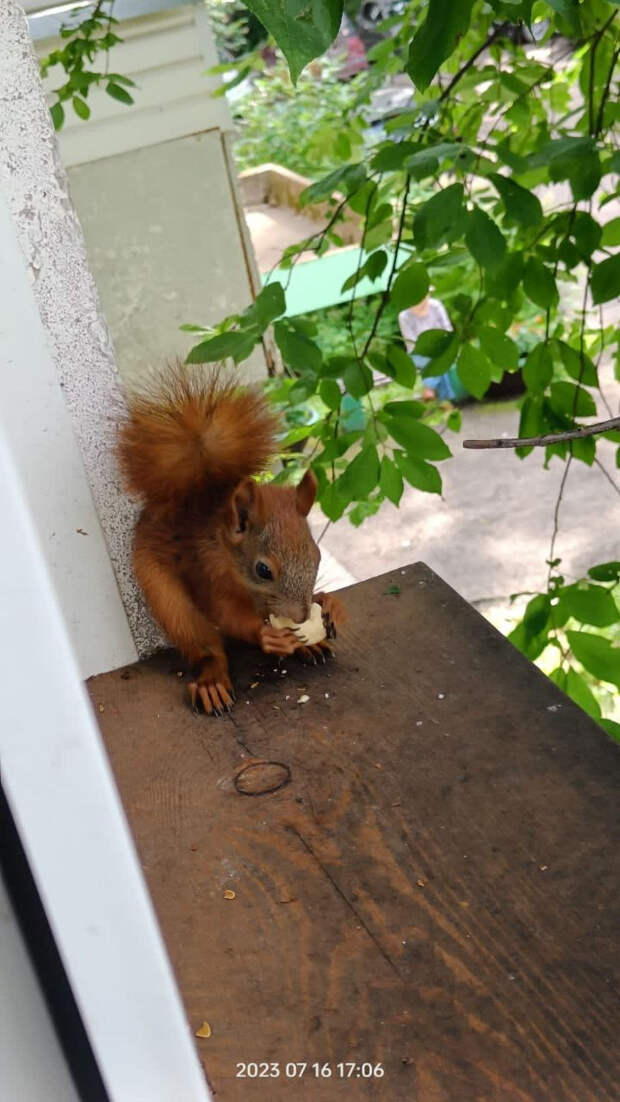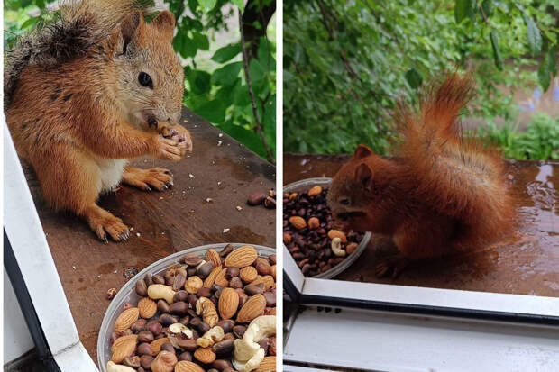 Сперва у нас за окном была кормушка, и я увидела, что бельчонок приходит, — рассказала Маргарита.Красноярка живет на втором этаже, и бельчонок с лёгкостью карабкался по веткам деревьев на подоконник. Тогда решили установить две кормушки на балконе и расширили подоконник на кухне, чтобы белкам было безопасно на нём находиться. Одну специальную кормушку приобрели в интернете примерно за 2000 рублей. А вторую изготовили самостоятельно.