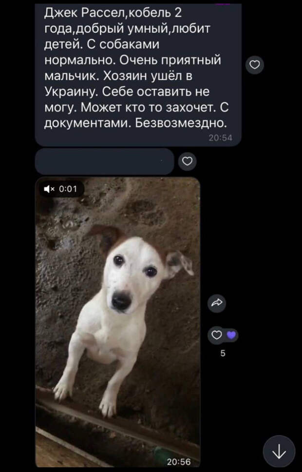 Есть в Красноярске и другие подобные случаи. Так, 29 сентября в одном из городских пабликов появилась запись, которая в дальнейшем стала распространяться по различным чатам — в хорошие руки пристраивали двухлетнего кобеля джек-рассела, хозяина которого мобилизовали. Опубликовала запись заводчица и владелица зоогостиницы Таяна Миллер.